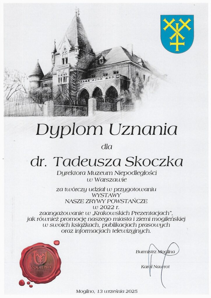 Dyrektor Tadeusz Skoczek otrzymał Dyplom Uznania od Burmistrza Mogilna, Karola Nauprota, za swój „twórczy udział w przygotowaniu WYSTAWY NASZE ZRYWY POWSTAŃCZE”. Wyróżnienie zostało przyznane także za zaangażowanie w cykl imprez „Krakowskie Prezentacje” oraz za promocję Mogilna i ziemi mogileńskiej w swoich publikacjach i mediach.