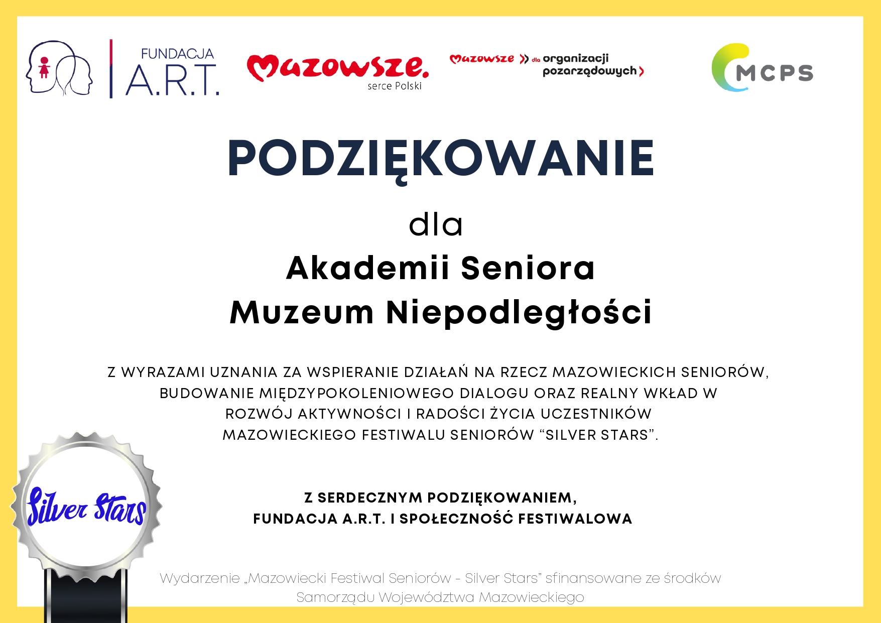 Jesteśmy ogromnie wdzięczni Fundacji A.R.T. oraz Społeczności Festiwalowej za wyjątkowe wyróżnienie dla  Akademii Seniora Muzeum Niepodległości, która z dumą wspiera działania na rzecz seniorów, budując dialog międzypokoleniowy i promując aktywność.  Cieszymy się, że nasz wkład w Mazowiecki Festiwal Seniorów „Silver Stars” został doceniony.
